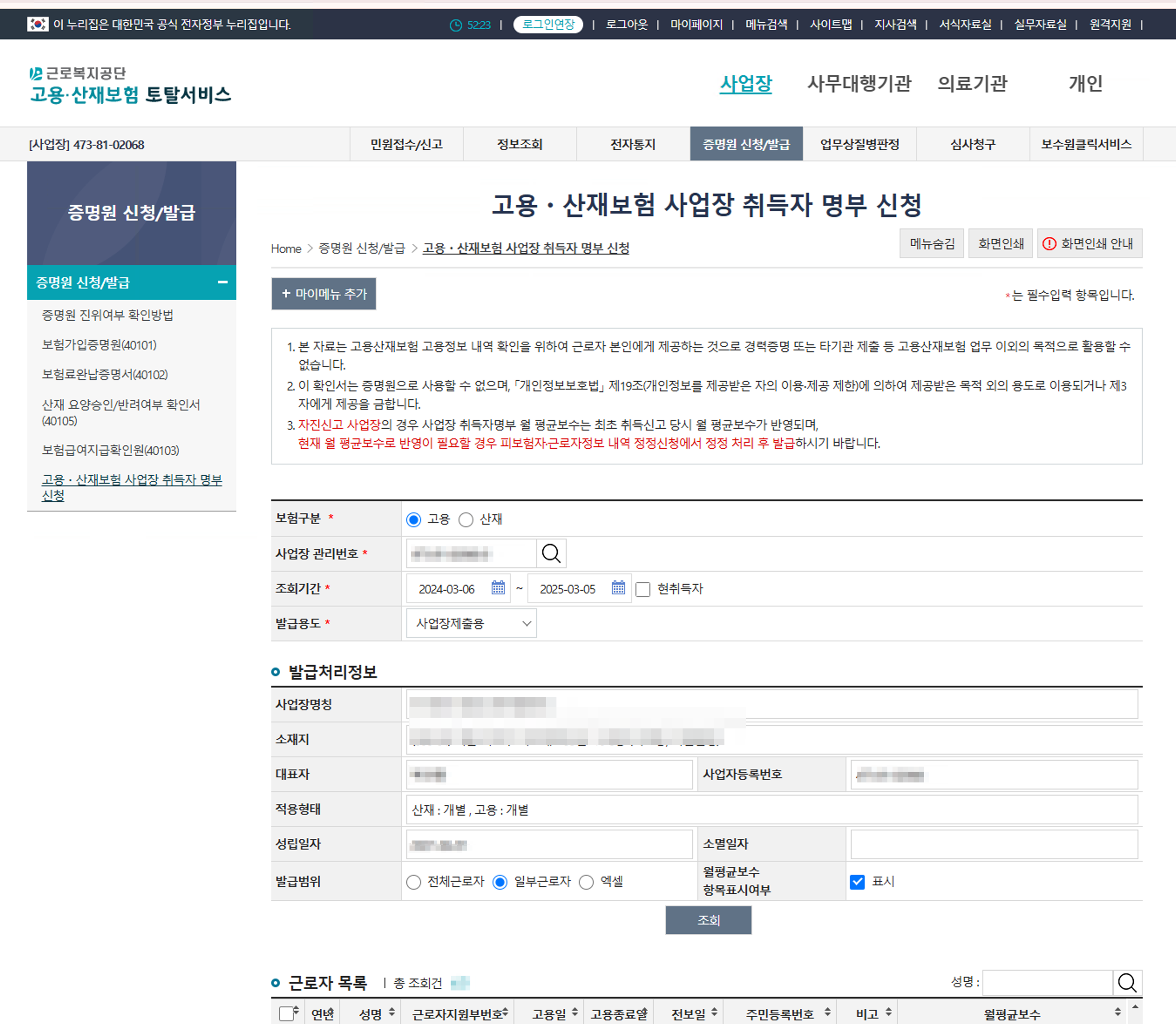 total.comwel.or.kr 고용산재토탈에서 [증명원 신청/발급]-[고용・산재보험 사업장 취득자 명부 신청] 메뉴를 통해 접근할 수 있다.